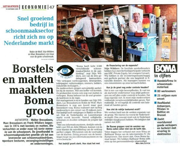 Twintig jaar geleden zette BOMA de eerste stappen op de Nederlandse markt. Wat begon met een postbus en een overname in Biddinghuizen groeide uit tot een landelijke organisatie met een stevige positie als kennispartner in de professionele schoonmaakmarkt. In twee delen blikken Gert Bresseleers (CEO BOMA Group) en Guus Nieuwlaat (Country director BOMA Nederland) terug op de ontwikkeling van het bedrijf in Nederland. Hoe begon het? Wat maakte het verschil in een markt die niet meteen stond te springen om een Belgische nieuwkomer? Van welke lessen en ervaringen leerden zij? En wat zijn de ambities?