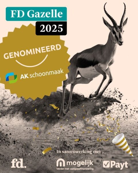 Voor AK Schoonmaak is het inmiddels traditie: het bedrijf is voor de zesde keer op rij genomineerd als FD Gazelle. “Trots met een hoofdletter T,” schrijft het team op LinkedIn. De organisatie dankt haar succes aan het hechte team, klanten en sterke samenwerkingen. Groei, zo benadrukken ze, doe je niet alleen.