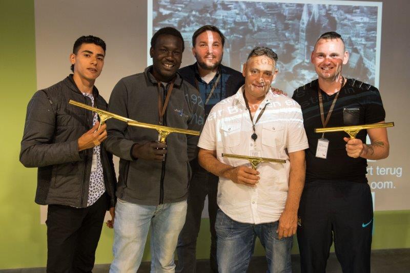 Gemeente Tilburg – vertegenwoordigd door Linda Bertens en Hans van Woensel – is blij voor de geslaagden én met de zeer schone ramen: “In zes weken zijn ze 36 keer gewassen”. Namens de vierde gemeente, Den Haag, overhandigt Michel de Bruin, CEO van Greenspeed, hun vakdiploma aan de ‘gassies’. De Bruin benadrukt dat de schoonmaakbranche, met al haar mogelijkheden en grote diversiteit, veel kan brengen: “Glazenwassen is een vak. Je komt overal: kantoorgebouwen, industrie, zorginstellingen. Je kunt er de hele wereld mee over. Ik hoop jullie met een fantastische baan of eigen bedrijf nog eens tegen te komen.”