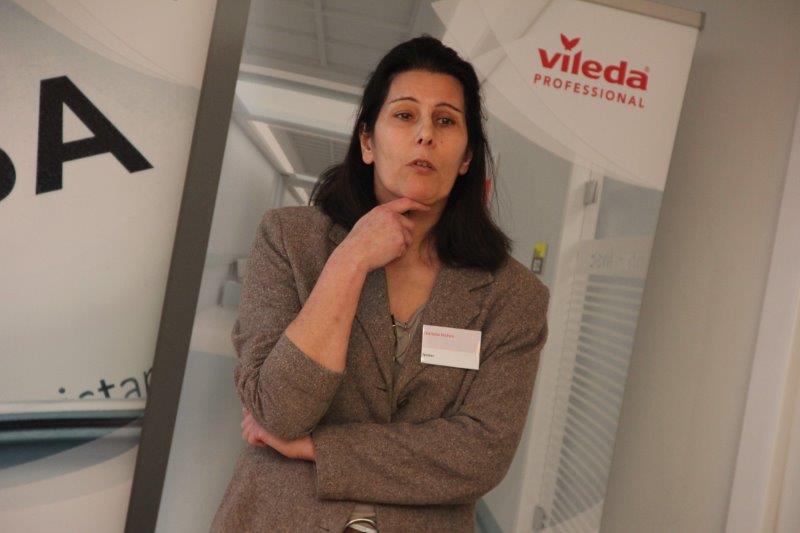 In de strijd om het aantal zorginfecties te reduceren, neemt het belang van goed schoonmaken toe en zullen instellingen meer moeten investeren in de schoonmaak en de samenwerking met infectiepreventie moeten intensiveren. “Hoe kunnen we daarmee omgaan en hoe kunnen ze elkaar versterken?”, is de centrale vraag en uitdaging van Charlotte. Het antwoord: “Op kwaliteit en kennis sturen, en niet op financiën.” Het lijkt een gelopen race als je bedenkt dat de extra kosten voor infecties en infectie-uitbraken torenhoog zijn en aanzienlijk gereduceerd of zelfs voorkomen kunnen worden door betrokkenheid van schoonmaakspecialisten en deskundigen infectiepreventie. “Wie zitten er aan tafel bij een aanbestedingstraject om vakinhoudelijke kennis te delen?”, vraagt Charlotte, wat tot enkele handopsteken in de zaal leidt. Te weinig mensen dus. “Infectiepreventie is onlosmakelijk verbonden met schoonmaak en het doorbreken van de infectiecyclus.”