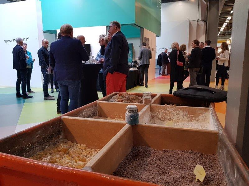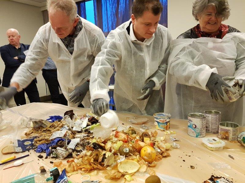 Voor de tweede workshop van Richard van Batenburg en Cor Gerritsen staken symposiumdeelnemers de handen uit de mouwen: in het Afval-lab van Renewi gingen afvalzakken leeg en op tafel. Zij doken in de berg afval voor afvalsortering over 21 dozen met afvalstromen: “De anatomie van de afvalzak”, zoals Richard het verwoordde. Een actief lesje over productensamenstelling, grondstoffen en recycling, én bewustwording van onze wegwerpmaatschappij.